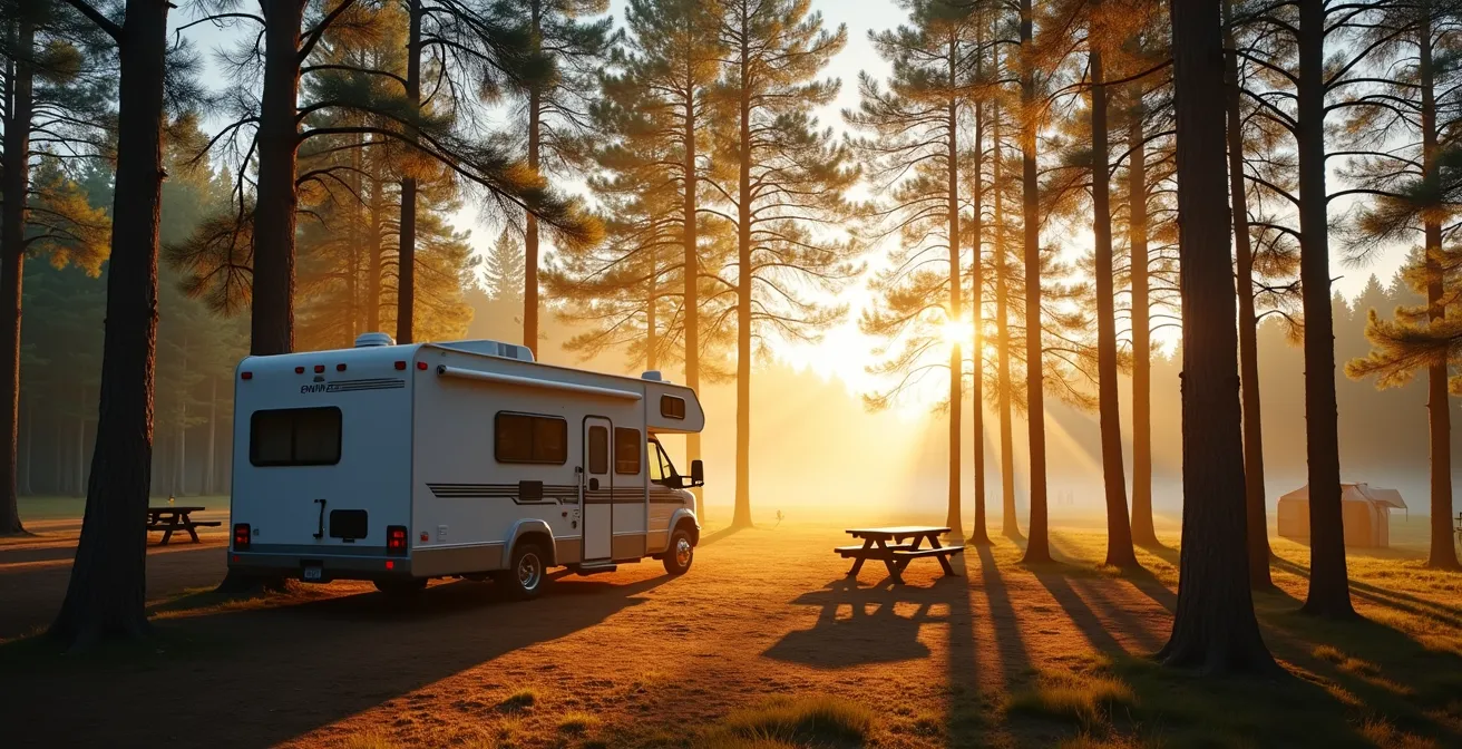 L’élément le plus imposant, votre véhicule récréatif ou votre voiture, doit être votre premier outil. Positionnez-le de manière à ce qu’il serve de « mur » par rapport au voisin le plus proche ou au chemin d’accès. L’auvent de votre VR ou un abri-cuisine peut ensuite être déployé pour définir la zone de vie principale, idéalement orienté pour profiter du soleil d’après-midi tout en étant à l’abri des regards. Le foyer, souvent un point fixe, devient le pivot autour duquel s’organise cet espace.